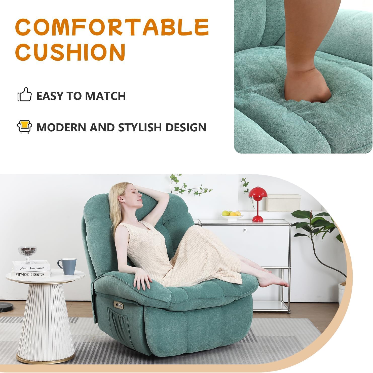 • Tissu en Chenille Premium : Le tissu chenille doux et respirant garantit un confort optimal, tandis que l'âme en mousse haute densité offre un soutien exceptionnel pour de longues heures de relaxation.